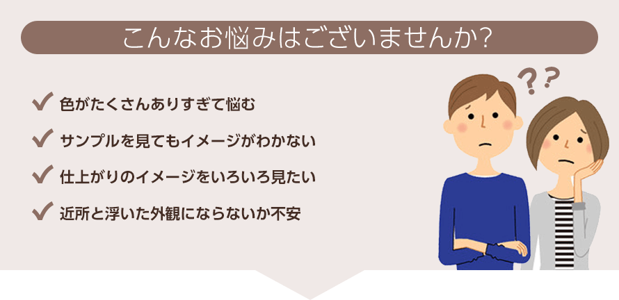 外壁塗装・屋根塗装を行う際、皆さんよく悩まれるのが色選びです。膨大な数のカラーサンプルの中から色を選んで、実際に塗装をしてみたらイメージと違った・・・という後悔はしたくないですよね。「想像以上に明るい色になってしまった」「地味過ぎてなんか暗い」「全然周囲に溶け込んでいない」など。