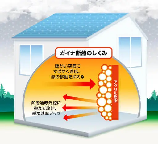 ガイナを建物内部に 塗布することで、内部の温度を逃がさないため、冬も夏も設定した温度を外へ逃がすことなく、快適な温度の空間 になります。